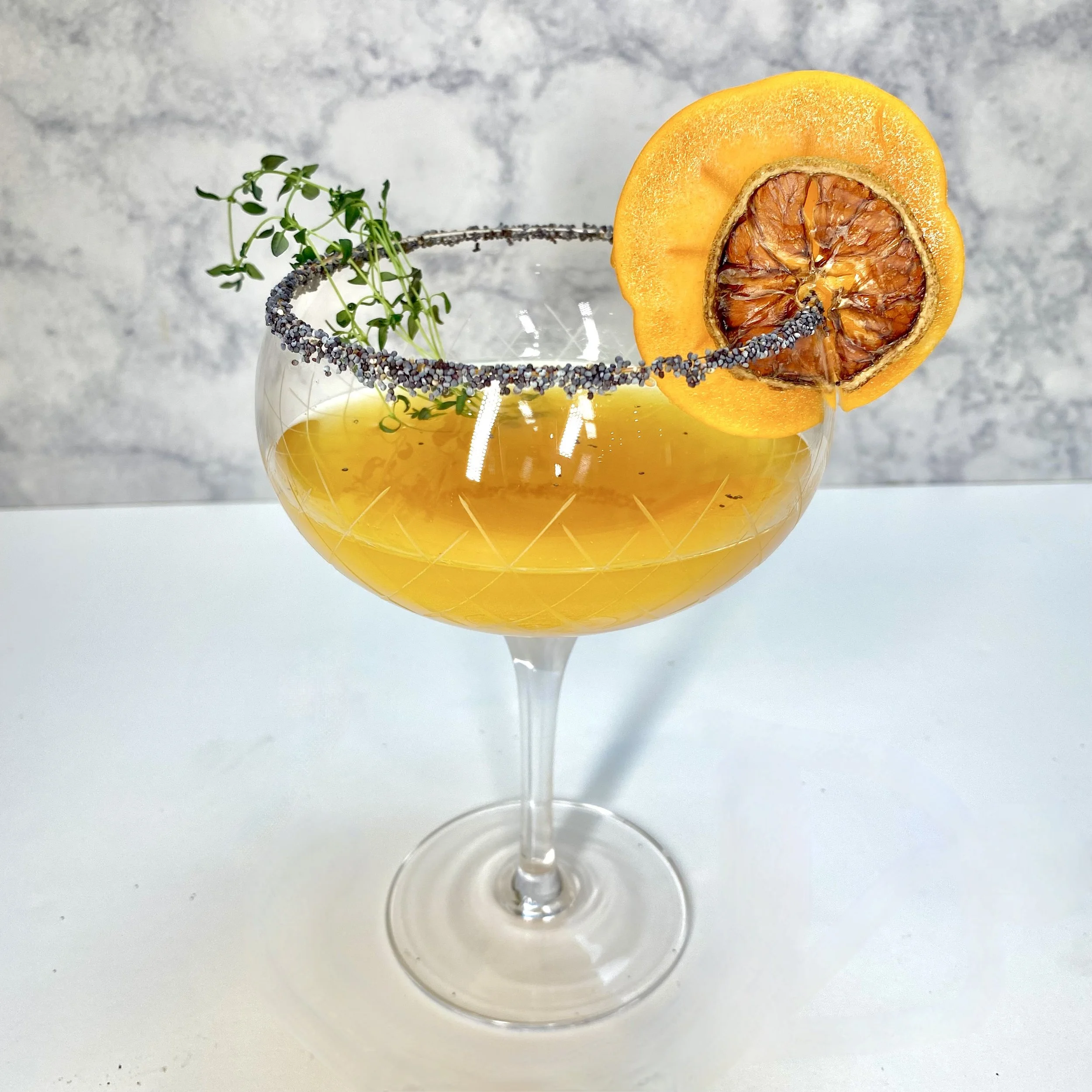 - Pour into prepared glass and garnish with dehydrated lemon slice, persimmon, and thyme stems (optional)